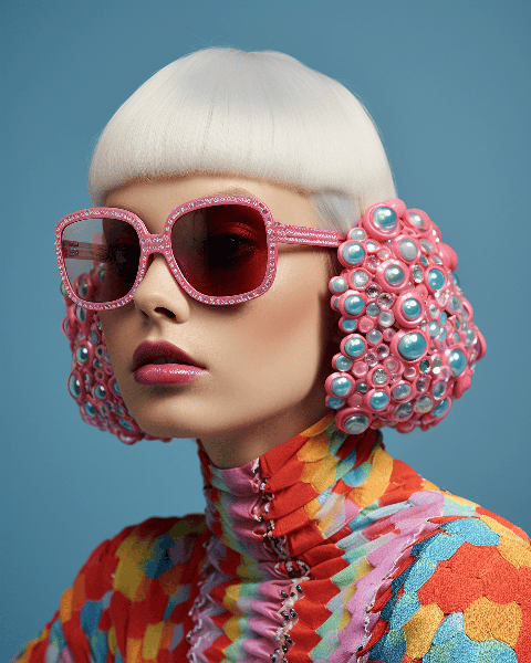 A pair of avant-garde sunglasses with vibrant, colorful lenses displayed on a mirrored surface under soft, diffused lighting. The image, in its boldness and innovation, channels the creative spirit of Yayoi Kusama --ar 4:5 --s 250 --v 6.0