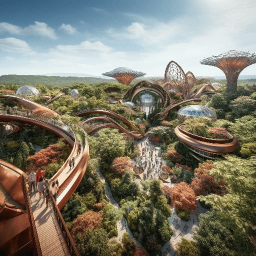 A whimsical theme park nestled in a lush forest, inspired by the creative mind of Santiago Calatrava. Emphasize the playful asymmetry and balance between man-made structures and nature. A wide aerial view captures the vibrant mosaic of rides and attractions amidst the verdant wilderness. --ar 1:1 --s 250 --style raw --v 6.0