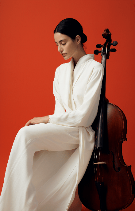 A model in a minimalist design by Ralph Lauren, her pose capturing the tranquility of a cellist lost in a melody. Profile shot in GQ by Erik Madigan Heck. --ar 9:14 --s 250 --style raw --v 6.0
