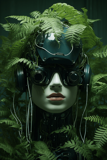 Explore a universe where artificial intelligence has taken the form of hyperrealistic plants, their cybernetic leaves photosynthesizing data The close-up view captures the intricate design of a data-processing fern, lending a cinematic quality to the scene by Cindy Sherman --ar 2:3 --s 250 --style raw --v 6.0