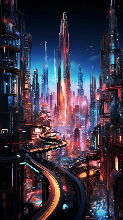 Dream up a fantastical cityscape inspired by Zaha Hadid. The skyline filled with fluid buildings, their shimmering glass facades warping the reflections of the city beneath. An aerial view at night would capture the vibrant neon lights bringing the city to life --ar 9:16 --s 250 --style raw --v 6.0