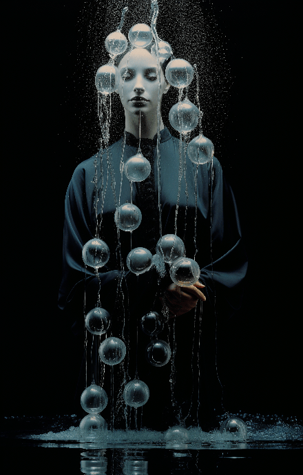 A model, in a classic Yves Saint Laurent piece, embodies the creativity of Aquarius. Full body shot, for Dazed & Confused, with a water-bearer subtly incorporated into the background, captured by Albert Watson. --ar 9:14 --s 250 --style raw --v 6.0