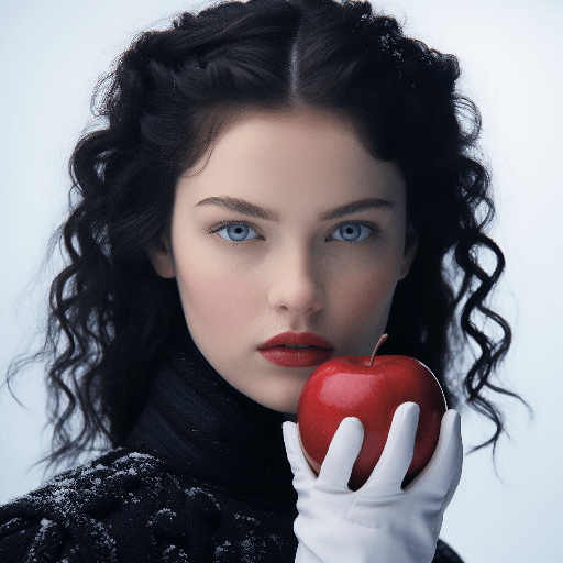 A Snow White concept, model with a perfect face holding a fashionable apple, extreme closeup, Harper's Bazaar, by Coco Chanel --ar 1:1 --s 250 --style raw --v 6.0