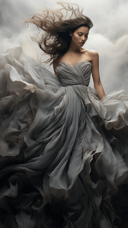 A richly dramatic fashion photograph of a female model, clad in a flowing, feathered gown, captured mid-twirl. The high-angle shot exudes energy, set against the backdrop of a serene, cloudy sky. Medium: Vanity Fair. Artist: Nadav Kander --ar 9:16 --s 250 --style raw --v 6.0