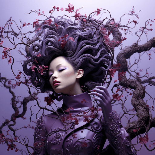 An illustration of a female, twisted branches, dynamic action scenes, light beige and purple, illusionistic detail, monumental murals, by Natalie Shau --ar 2:3 --s 250 --style raw --v 6.0