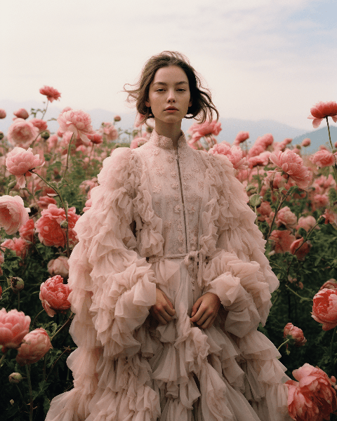 A model wearing a striking outfit by Alexander McQueen stands amidst a field of peonies, a symbol of Zen. Extra long shot, for Madame Figaro by Alec Soth. --ar 4:5 --s 250 --style raw --v 6.0