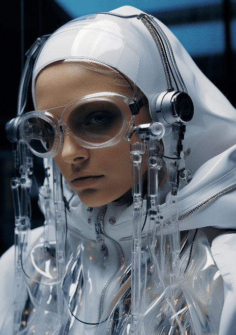 A model poses gracefully in a Balenciaga ensemble, her backdrop a mesmerizing display of 2025's advanced technologies. Close up, for Elle by Alec Soth, illustrating the future's fascination. --ar 5:7 --s 250 --style raw --v 6.0