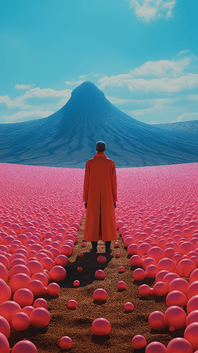 ultra wide shot. in the style of the film the holy mountain. 1970’s minimalistic photography. Non objective photography. Colorful surrealist film still. Wavy and fluid. Psychedelic. Trippy. Weird. Chaotic assembly in comic choreographed movements. wide open limimal field. hundreds if people on an escalator/conveyer belt. catapulted off falling to the ground. --ar 9:16 --s 250 --style raw --v 6.0