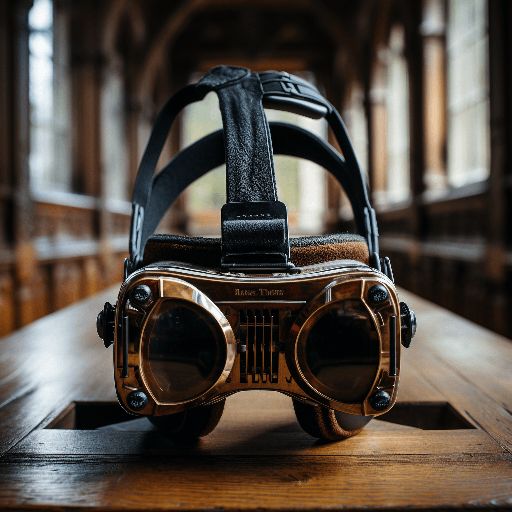 A high-tech VR headset resting on an antique wooden desk. The blending of old-world charm with futuristic technology is captured in a style inspired by Andreas Gursky's wide-angle compositions. --ar 1:1 --s 250 --v 6.0