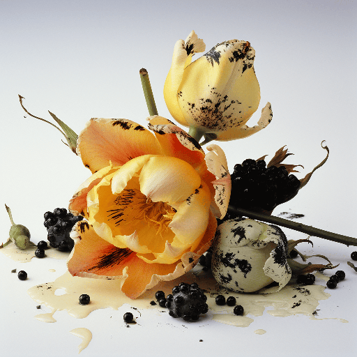 Irving Penn Photograph, Irving Penn still life One flaming parrot tulip, 2 large beetles, a blackberry, a robin's egg Graphic design, minimalism, light yellow surface, light yellow seamless background, medium close up, high angle, 8x10 camera, large format, directional lighting, high contrast --s 250 --style raw --v 6.0