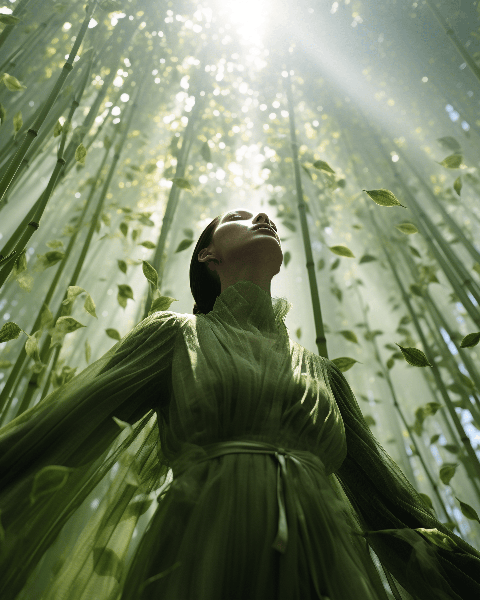 Create an image of a model from 2023, adorning an ethereal Elie Saab gown, in a dreamlike bamboo forest, low angle view, Vogue, by Guy Bourdin --ar 4:5 --s 250 --v 6.0