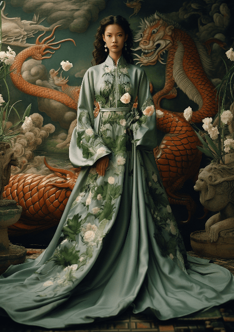 In the heart of a lush Chinese garden, a high fashion model dons an exquisitely crafted gown by Gucci, the fabric adorned with Chinese dragon and phoenix motifs. The full-body shot, elegantly captured by Alessandra Sanguinetti for Vogue, imbues a sense of strength and serenity, balanced against the vibrant backdrop --ar 5:7 --s 250 --v 6.0