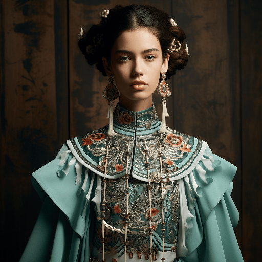 A sophisticated fashion model styled in vibrant Chinese Hanfu, adorned with jade accessories, confidently gazing at the camera. Close-up perspective, captured in the visual aesthetics of Harper's Bazaar. Featuring an intricate carved wooden screen as the backdrop. By Alexander McQueen --ar 1:1 --s 250 --style raw --v 6.0
