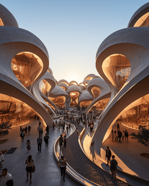 Envision a Zaha Hadid style shopping complex in Dubai, its fluid design resembling dunes in the desert. A wide angle shot captures the complex in the golden light of the setting sun, with shoppers crowding the entrance, designed by Hadid --ar 4:5 --s 250 --style raw --v 6.0
