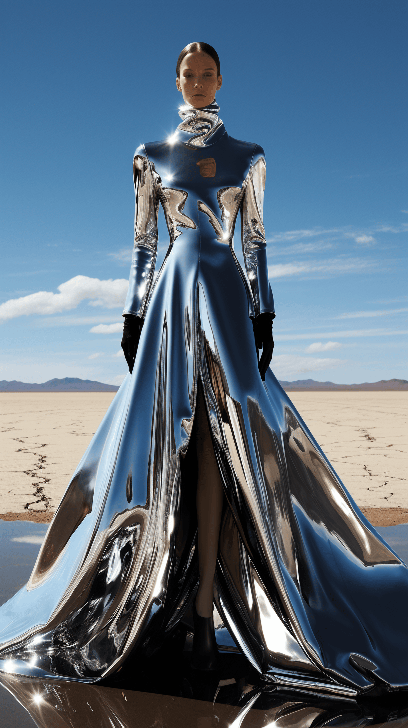 Behold a high fashion model in Balenciaga, her silhouette mirrored on the shiny surface of a desolate desert. This wide view shot for Vogue by Nick Knight, portrays a daring symmetry, echoing the loneliness and majesty of the scene --ar 9:16 --s 250 --v 6.0