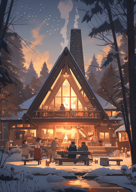A cozy winter evening scene, a family gathered around a fire in a snow-covered cabin, brought to life in the style of Carl Kleiner. The wide-angle view captures the warmth of the cabin against the cold, snowy landscape outside --ar 5:7 --s 400 --niji 5
