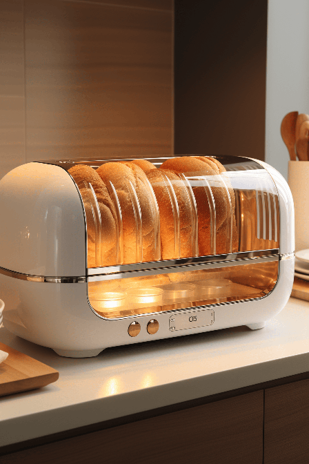 A futuristic bread bin, imagined by Dwell, exudes light luxury. The bin, showcased in a high-resolution 3D render, features a clean background and a simple composition. Its sculptural precision is illuminated under studio lighting, enhancing its super detail. --ar 2:3 --s 250 --style raw --v 6.0