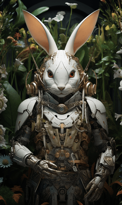 A rabbit, surrounded by plants, in spring, with a futuristic style, Paul Cofield, Surrealist details of the Middle Ages, Alexander Quinn, Oleksandr Bogomazov, - ar 2: 3, - q 2, - v 5, iw 2 --ar 3:5 --s 250 --style raw --v 6.0