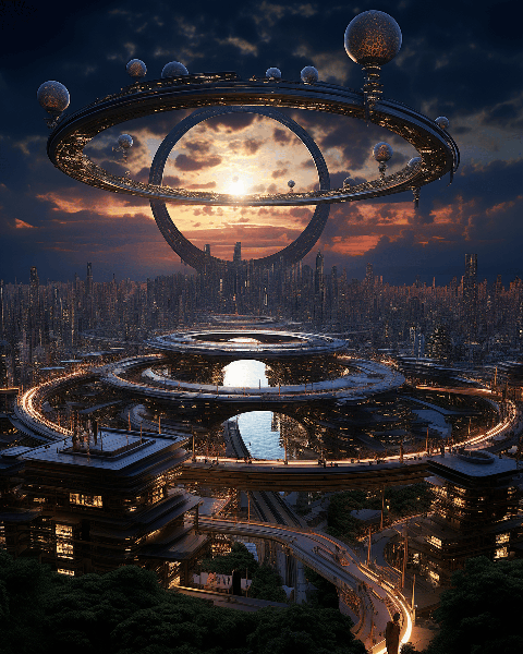 A floating city in the sky, held aloft by zeppelin-like structures and interconnecting sky-bridges, conceived by Buckminster Fuller. An extra-long shot reveals the majesty of this airborne metropolis set against a dramatic sunset --ar 4:5 --s 250 --style raw --v 6.0