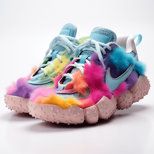 An nike sneaker,Radical shape, voluminous, furry, extra long fur all over, colorful gradiend cool color fur, Nike swoosh, white background --s 250 --style raw --v 6.0