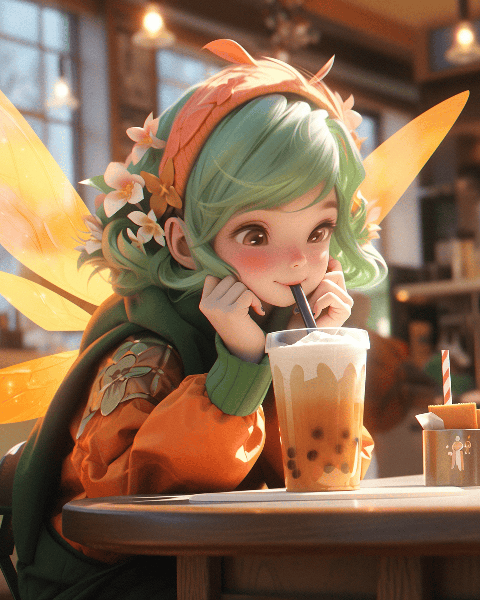 A mischievous pixie, styled by Bill Durgin, flits around a bustling coffee shop, stealing sips from customers' cups. Close-up shot captures her vibrant wings, hyper detailed, unreal engine 5 --ar 4:5 --s 400 --niji 5