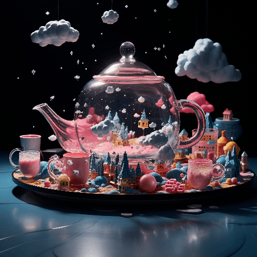 A surreal scene unfolds with a whimsical floating tea party amidst pastel-coloured clouds, inspired by the pop art of Ettore Sottsass. The perspective is a close-up on the table, with a celestial teapot pouring a river of stars into waiting cups --ar 1:1 --s 250 --style raw --v 6.0