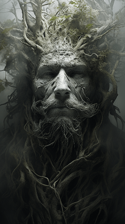 A portrait of a forest spirit by Albert Watson, its face formed from intertwining branches and foliage, with a wise, serene expression. --ar 9:16 --s 250 --style raw --v 6.0