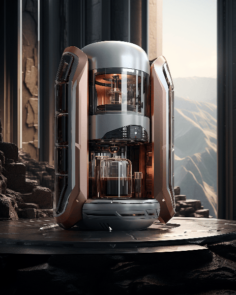 Envision a coffee machine that encapsulates the sleek, futuristic lines of high-tech design. The machine's exterior is bathed in a smooth, metallic finish, with LED lights softly illuminating its key features. The stunning image, created with Unreal Engine 5, is presented in 16K for ultra-fine details, capturing every curve and gleam of the device. Set against a clean, white background, the coffee machine stands as a symbol of modernity and efficiency --ar 4:5 --s 250 --style raw --v 6.0