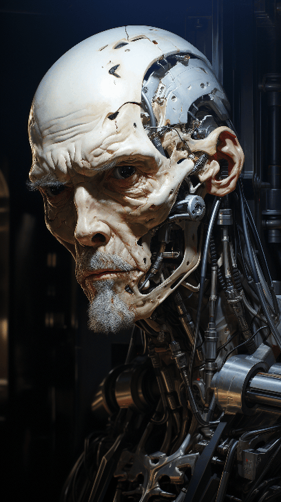Visualize a character design inspired by Werner Herzog, reimagined as a cyborg. Rendered in rich oil paints with thick, expressive brushstrokes, this full-body portrait captures the unique personality and aura of the famous filmmaker, now transposed into a futuristic context. --ar 9:16 --s 250 --style raw --v 6.0