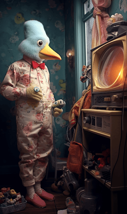 An adult man dressed as a duck looks out the window from a small apartment, next to children's toys, slippers and family underpants, an old refrigerator and a computer, pop surrealism, lowbrow art, hyper realism, muted colors, rococo, Natalie Shau, Loreta lux, Tom Bagshaw, Mark Ryden, Trevor Brown style, ultra - detailed, intricate details, ultra - realistic, unreal engine, octane render --ar 3:5 --s 250 --style raw --v 6.0