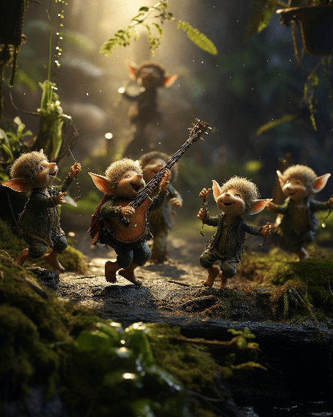 A band of pixies caught in a merry dance in a grove of the enchanted forest. Status: Their expressions full of joy, they are captured mid-twirl. Composition: High-angle shot, with the colorful pixies standing out against the green forest floor by Adrian Donoghue --ar 4:5 --s 250 --style raw --v 6.0