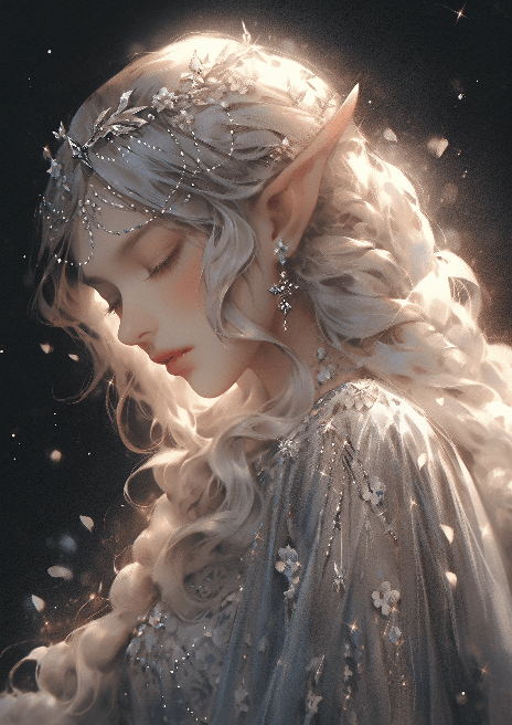 An elven maiden bathed in moonlight, her ethereal beauty is accentuated in Japanese retro style. Captured in a close-up, her expressive eyes glitter with secrets, in a composition that rivals the mesmerizing portraits of Albert Watson. Rendered in UHD for stunning detail. --ar 5:7 --s 400 --niji 5