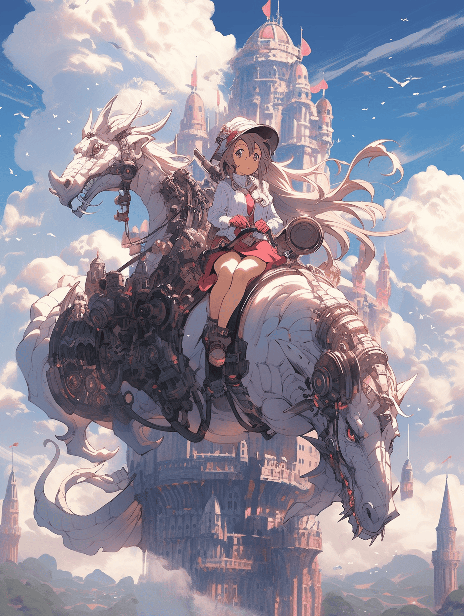 A steampunk girl with goggles and a jetpack riding a mechanical dragon over a floating castle. Fantasy adventure illustration, JR RPG style, Horikoshi Nobuyoshi. Vibrant palette, imaginative design details. --ar 3:4 --s 400 --niji 5