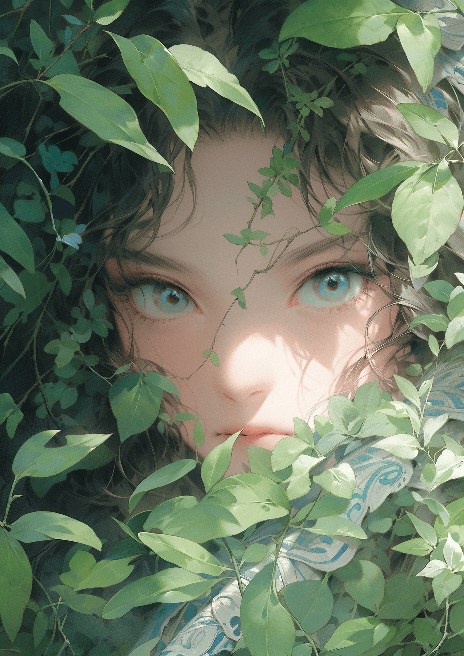 Picture a mysterious forest nymph, the allure of her beauty captured in the style of Fang Lijun. Her striking face is shown in close-up, radiating an ethereal glow. The extreme close-up focuses on her mesmerizing eyes, set against a lush forest scene akin to those found in National Geographic, drawn with fine details and rendered in 8K quality. --ar 5:7 --s 400 --niji 5