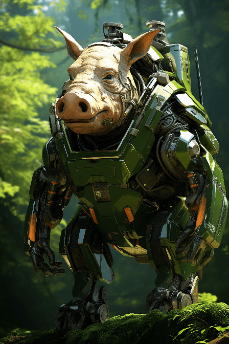 "Witness an epic scene of a powerful and friendly cyborg, Porkchop the pig-shaped mech, in a solarpunk environment. The dynamic pose and hyper-detailed features of the mech are beautifully contrasted with the lush green surroundings --ar 2:3 --s 250 --style raw --v 6.0