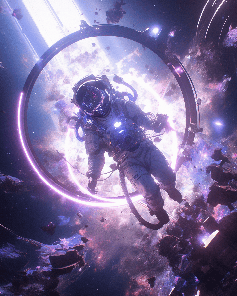 A retro astronaut floats before a cosmic nebula of blue and purple swirling gases and glimmering stars, planet rings visible behind him. His white spacesuit and helmet reflect the galactic lights, intricate mechanisms and panels clearly visible. Cinematic lighting, sense of sci-fi wonder. Unreal Engine. --ar 4:5 --s 400 --niji 5