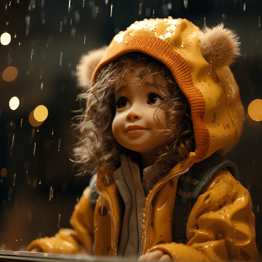 An illustration with a cartoon girl wearing raincoat and pointing at the raining window sad smile, in the style of joel robison, emotional expressions, animated gifs, flickr, close - up, plush doll art, mommy's on - the - phonecore, --s 250 --style raw --v 6.0