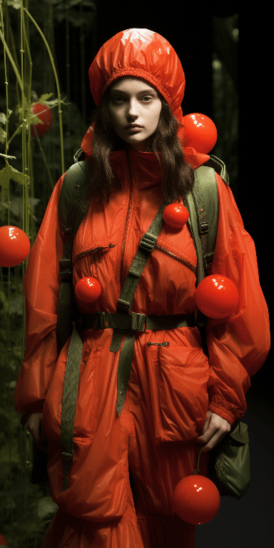 Sentient tomato, Balenciaga - clad, exploring lush jungle adventure --ar 1:2 --s 250 --style raw --v 6.0