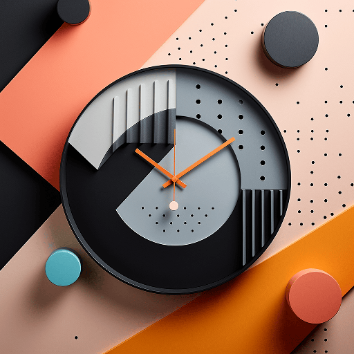 A collaboration with Creative Review reveals a modern, high-end design of a wall clock. The clock, with its bold textures and simple design, captures the eye under the soft glow of studio lighting. The conceptual design is reminiscent of the Memphis design, but with a futuristic twist. --ar 1:1 --s 250 --style raw --v 6.0