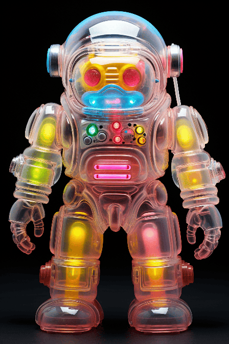 In a nice design style, Retro photography of a translucent bio - tech Bigfoot creature toy, coating design 60's retro robot, many visible electronic analog boxes to integrate on the armor and the helmet, different sections colours translucent plastic wear, many luminescent energy halo, neon iridescent plasma, reflets prismatic, futuristic materials, biomorphic parts technological development, 3d octane render, gliterry with bio luminescent technologie, strange atmosphere, unreal vision, nebula, hyperrealistic photography, 3D shading, tone mapping, ray tracing, ultra detailled scene, magnificent photographic light, cinematic, epic realistic, insane details, advertising shot, in a dynamic portrait pose, shot from an ultra low camera angle, photography with some flaws, lens flare, ultra - sharp and 8K resolution, shiny feathers, and rich textures, dynamic composition, wide angle, 8K --ar 2:3 --s 250 --style raw --v 6.0