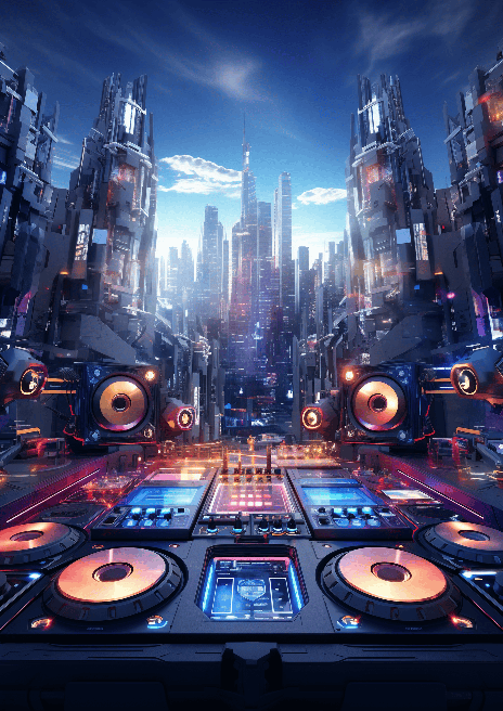Picture a creation by Commarts. A futuristic, modular DJ set that features a stunning image and high-tech design. The style is a blend of Memphis design and Futurism. Render it in 3D, in a rooftop party setting under disco studio light. Capture the super detail in UHD, 16K resolution. --ar 5:7 --s 250 --style raw --v 6.0