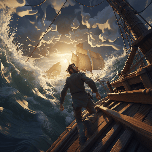 A fearless pirate standing aboard his ship, his face grinning confidently into the tempest, captured in a wide-angle shot. Rendered in the expressive style of Rob Gonsalves, and the environment brings to mind a stormy seascape as featured in National Geographic. UHD, 8K details. Artist: Leon Spilliaert --ar 1:1 --s 250 --style raw --v 6.0