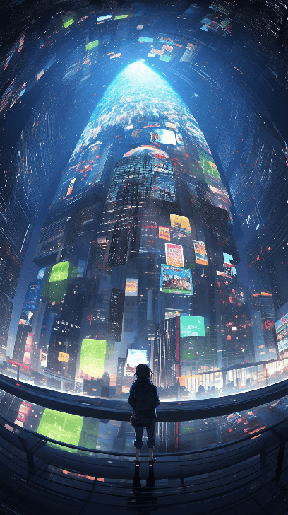 Imagine a daring cyberpunk scene, a lone hacker stands in a sea of neon signs, rendered in a 3D model art style. Capture the scene from a fisheye lens perspective, intensifying the dazzling lights and towering buildings. The intense colors and technological elements should remind viewers of the evocative style of Liam Wong. --ar 9:16 --s 180 --v 6.0