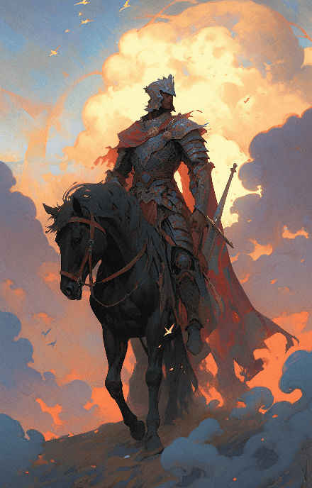 A breathtaking scene unfolds as a lone knight strides boldly towards an unseen foe, the hilt of his sword glinting in the waning light. The knight's face is hidden behind his helm, adding to his enigmatic aura. The setting sun colors the sprawling battlefield in hues of orange and purple, casting long shadows that dance and flicker. The rich dynamics of the scene are heightened by the art style of Japanese retro, with its vivid colors and expressive lines. Brought to life by the talented Akos Major, the composition is rendered in an ultra HD 8K resolution --ar 9:14 --s 180 --v 6.0