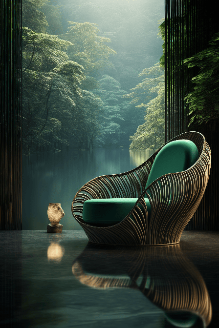 Visualize a design by Wallpaper*. A futuristic, bamboo woven armchair that emulates nature. Display sculptural precision and intricate detail. Rendered in 3D against a quiet, forest backdrop with a calm water reflection. The naturalistic style blends modernism with tranquillity. Show it in ultra-high definition with 16K resolution. --ar 2:3 --s 250 --style raw --v 6.0