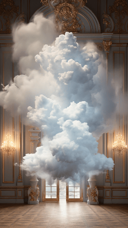 Visualize a Berndnaut Smilde creation. An indoor ballroom with opulent Rococo decor is mysteriously filled with a surreal cloud, suspended in mid-air. This scene, capturing the unlikely interplay of indoor luxury and outdoor ephemera, is rendered in high-quality, ultra-detailed 16K 3D art. --ar 9:16 --s 250 --style raw --v 6.0