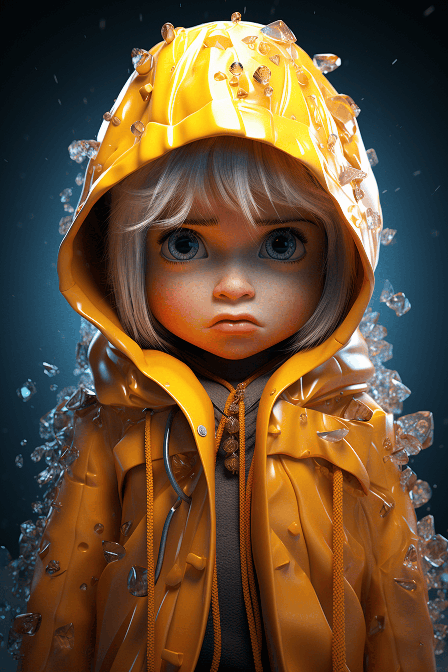 An icy baby looking at someone in a poncho, in the style of zbrush, water drops, horror academia, tiago hoisel, yellow and azure, emphasis on emotion, toy - like proportions --ar 2:3 --s 250 --style raw --v 6.0