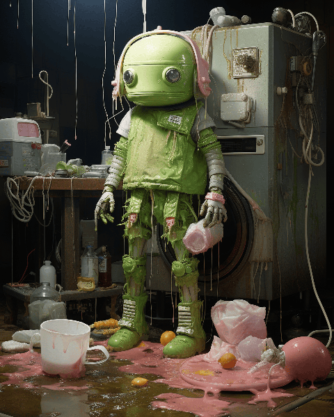A green robot is standing on a scooter,, messy, frank quite, soggy, elaborate costumes, by Mao Hamaguchi --ar 4:5 --s 250 --style raw --v 6.0