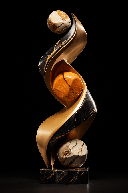 Imagine an art ornament with the sculptural precision of a Constantin Brâncuși sculpture and the fluid forms reminiscent of the Memphis design movement. This hybrid style combines strict geometrical shapes with organic, flowing lines. The ornament itself appears to be crafted from marble and gold, showcasing a vibrant play of textures and reflections under studio lighting. The rendering will be in ultra-high detail, emphasizing the meticulously polished surfaces --ar 2:3 --s 250 --style raw --v 6.0
