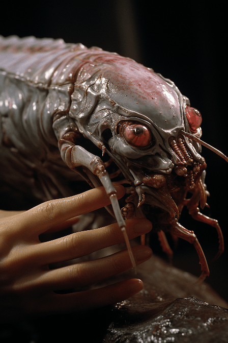 A robotic alien devours a handful of bugs in a scene from a 1972 film The close-up shot, rendered in hyperrealistic detail, explores the grotesque in a cinematic way by John Waters --ar 2:3 --s 250 --style raw --v 6.0